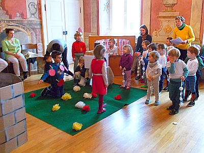 (ra) Buntes Treiben herrschte am Mittwochvormittag im Kaisersaal der Schlossklinik Rottenburg: Die Kinder des Waldkindergarten Rottenburg und Umgebung e.V. erfreuten die Patienten der geriatrischen Rehabilitation und der Anschlussheilbehandlung nach orthopädischen und unfallchirurgischen Eingriffen mit der bekannten Geschichte „Frau Holle“ und passenden Liedern.
