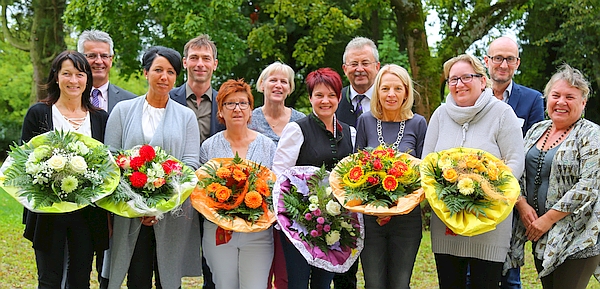 (v. l.) Martina Hofmeister, Vorstand Robert Betz, Martina Huber, Verwaltungsleiter Bernhard Fürst, Franziska Schmidt, Personalratsvorsitzende Elke Zschauer, Claudia Arnold, Landrat Josef Laumer, Barbara Schindlbeck, Gerlinde Ehner, Pflegedirektor Johannes Pirner und Personalrätin Anita Stühler. – Foto: Klinik Mallersdorf