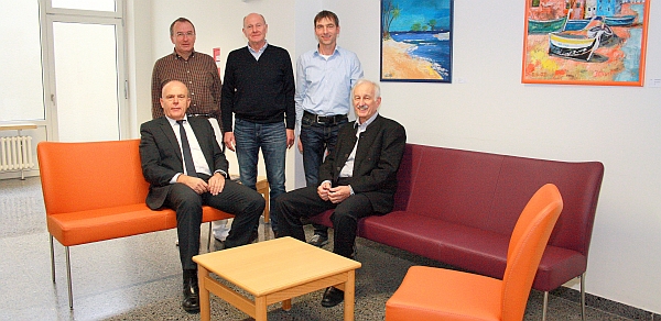 Fördervereinsvorsitzender Dr. Dietrich Mehlhorn (2. v. links) traf sich mit den Vorstandsmitgliedern Karl Wellenhofer (links) , Ludwig Gallmeier (rechts)  und Kassier Josef Braun (3. v. links) gemeinsam mit Bernhard Fürst (2. v. rechts), Verwaltungsleiter der Klinik und Schriftführer des Fördervereins, am Mittwoch zur offiziellen Übergabe mit „Probesitzen“.