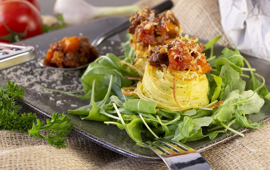 Wer die schmackhaften Kartoffelnudelnester nachkochen möchte, findet das Rezept und eine einfache Videoanleitung hier: https://www.die-kartoffel.de/19-blog/rezepte/554-kartoffelnudelnester-mit-sauce-bolognaise.