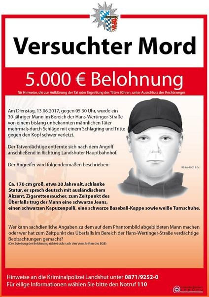 (pol) Bereits am 13. Juni wurde gegen 5.30 Uhr ein 30-jähriger Mann im Bereich der Hans-Wertinger-Straße in Landshut von einem bislang unbekannten männlichen Täter mehrmals durch Schläge mit einem Schlagring und Tritte gegen den Kopf schwer verletzt. Jetzt sucht die Polizei mit einem Phantombild nach einem Tatverdächtigen.