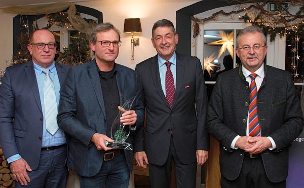 Stellvertretend für die Justland GmbH nahm Robert Hundacker (2. v. links) die Auszeichnung entgegen. – Von links: Wirtschaftsförderer Erich Brunner, Handwerkskammer-Präsident Dr. Georg Haber und Landrat Josef Laumer, – Foto: Haas