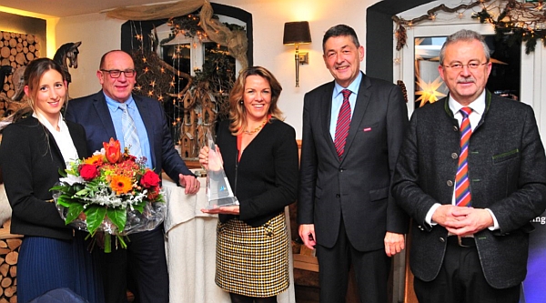 Den Preis nahmen Johannes Fruhstorfer (rechts) mit Frau Susanne und Elmar Schlicksbier (3. v. rechts) entgegen. Es gratulierten (v. links) Landrat Josef Laumer, Wirtschaftsförderer Erich Brunner und Handwerkkammer-Präsident Dr. Georg Haber. – Foto: Haas