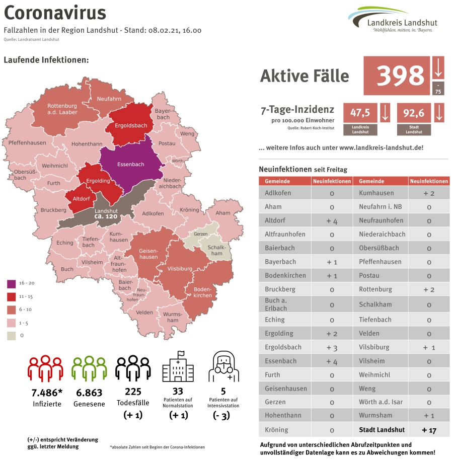 Die Stadt Landshut weist derzeit einen Wert von 92,6 aus, der über das Wochenende ebenfalls gesunken ist. Aufgrund der Tatsache, dass der Berechnung je 100.000 Einwohner zu Grunde gelegt werden, die Stadt Landshut aber lediglich rund 73 000 Bewohner verzeichnet, unterliegt dieser Wert in diesem Zusammenhang starken Schwankungen.