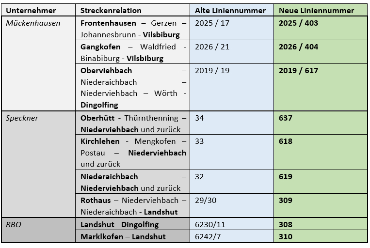 Unter Federführung des Landshuter Verkehrsverbunds (LAVV) haben sich die drei Landkreise auf einheitliche Liniennummern geeinigt, die ab 01. Januar 2024 auf den Bussen geführt werden.