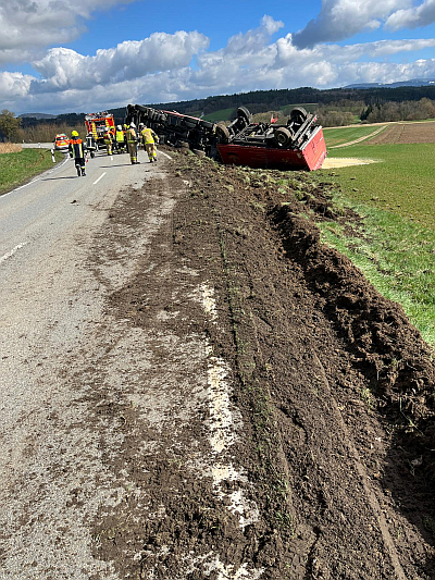 (pol) Auf der Kreisstraße zwischen Wolferszell und Gschwendt kam am Montag kurz vor Mittag ein 48-jähriger Lkw-Fahrer mit seinem Gefährt von der Straße ab. Der Lastwagen und der Anhänger – beide Fahrzeuge mit Kraftfutter beladen – kippten zur Seite. Dabei wurde der Fahrer verletzt und musste durch den Rettungsdienst in ein Krankenhaus gebracht werden.