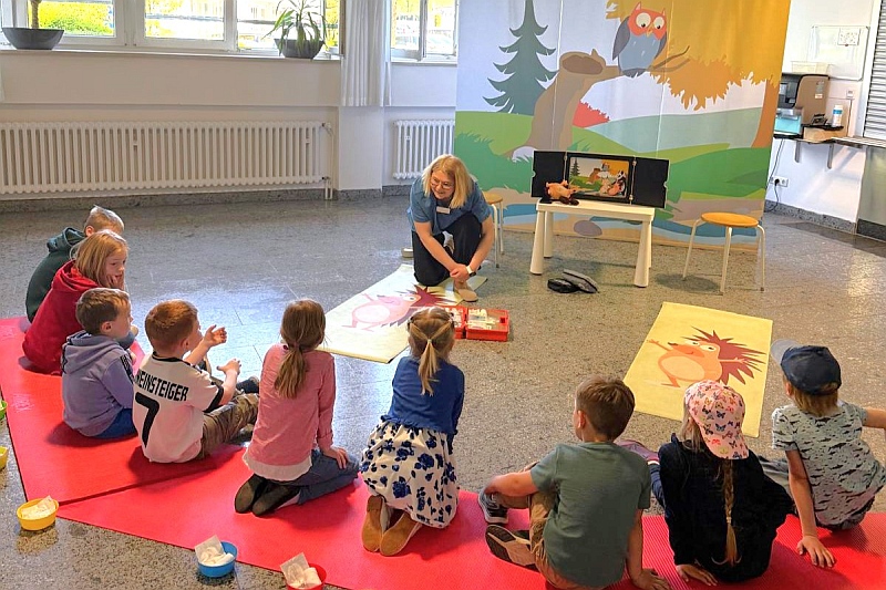 Tanja Mahnken mit Kindern beim Pflasterpass-Kurs – Foto: Klinik Bogen/Silvia Huber