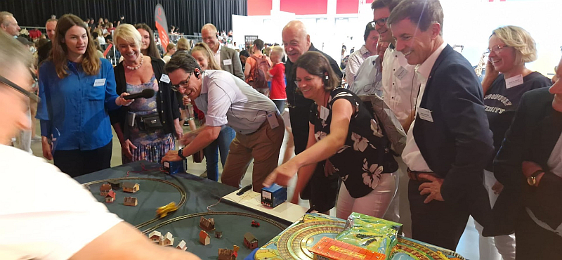 Am Nachmittag machten sich Bayerns Bauminister Christian Bernreiter und Thomas Erndl, MdL, bei einem Rundgang ein Bild von den spannenden Angeboten der Aussteller. Sie probierten sich bei der einen oder anderen Mitmachaktion aus, bestanden die Nagelprobe bei „Baumeister gesucht“ und setzten im Kurbelgenerator-Wettbewerb Modelleisenbahnen in Bewegung – Ergebnis unentschieden.