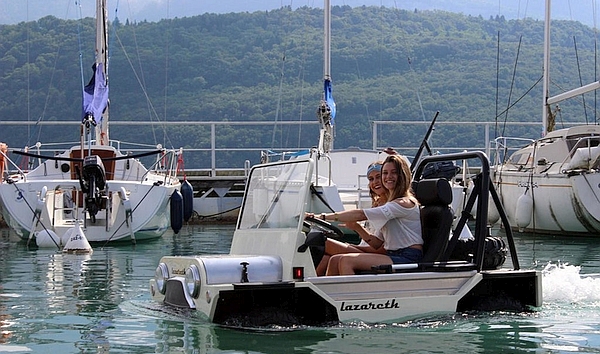 Für einen Menschen, der zum ersten Mal am Steuer eines solchen Gefährts auf ein Gewässer zufährt, schießt mit Sicherheit der Gedanke durch den Kopf: „Ich weiß, dass dieser Wagen schwimmen kann. Aber weiß er das auch?“ Beim Lazareth Moke Amphibious, wie sein offizieller Name lautet, kann er ganz beruhigt sein. Ähnlich wie bei kleinen Booten sorgt geschlossen-poriger Schaumstoff in den Hohlräumen der Alu-Karosserie für den nötigen Auftrieb.