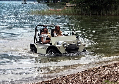 Als lustiges Beiboot (oder Dinghi wie die Segler sagen) dürfte der Land-und-Wasser-Moke überall wo er auftaucht, für Furore sorgen. Sein Allradantrieb lässt ihn selbst Strände mit sandigem Untergrund locker erklimmen, und eine Straßenzulassung als Amphibienfahrzeug hat er auch. Einziger Haken ist sein Preis von 42 000 Euro. Recht happig für eine 2,30 Meter kurze Version des ursprünglichen Mini Moke, dem die Rücksitze fehlen und der keinen Kofferraum hat. Das Auto wird daher auch nur auf spezielle Bestellung produziert. Für deutsche Gewässer ist ein Bootsführerschein erforderlich.