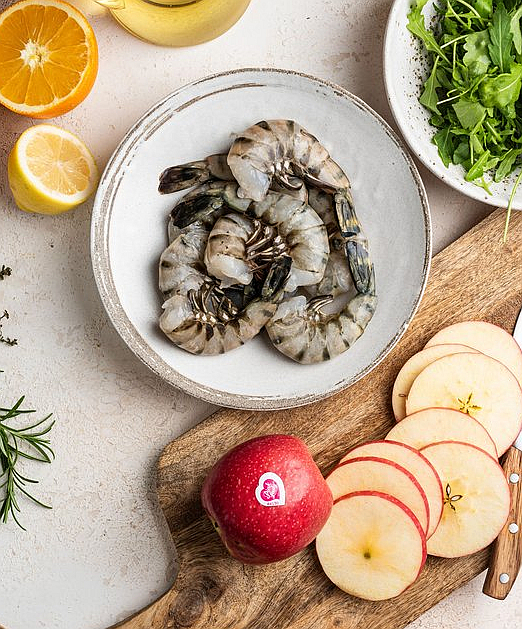 Rezeptidee: Apfel-Carpaccio mit Riesengarnelen und Rucola