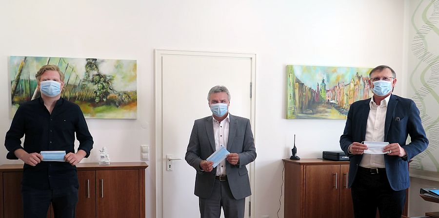Rainer Biller (rechts) übergab gemeinsam mit Sohn Michael Rainer Biller (links) 1000 Schutzmasken als Spende an Landrat Peter Dreier.  – Foto: Landratsamt Landshut