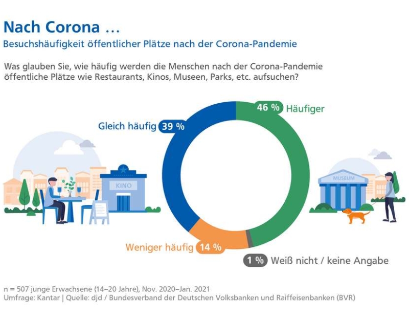 Knapp die Hälfte der Befragten glaubt, dass die Menschen Parks, Museen, Kinos und Restaurants nach der Pandemie häufiger besuchen werden als zuvor, 39 Prozent gehen von einer gleichbleibenden Besuchsfrequenz aus. Und nur 14 Prozent meinen, dass öffentliche Plätze seltener aufgesucht werden als davor.