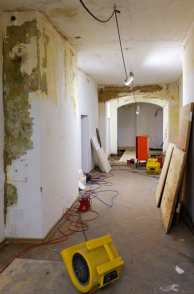 Seit Anfang dieser Woche laufen die Rückbauarbeiten in verschiedenen Bereichen. So werden etwa historische Bodendielen ausgebaut und fachgerecht eingelagert. Zahlreiche Deckenverkleidungen, Wände in Trockenbauweise und Bodenbeläge, die durch das Löschwasser in Mitleidenschaft gezogen wurden, werden nach Vorgabe des Denkmalschutzes ausgebaut und entsorgt. Historische Bauteile werden entsprechend gesichert und einer weiteren Befundung unterzogen. Alle Rückbauarbeiten werden durch einen fachkundigen Restaurator begleitet. Dieser koordiniert die beauftragten Firmen und zeichnet für die Sicherung und Dokumentation denkmalpflegerisch wichtiger Befunde verantwortlich.