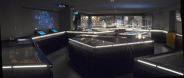 Der Raum wirkt futuristisch: Es gibt keine Deckenbeleuchtung, nur LED-Bänder an den Vitrinen. Es scheint als hätte der Kommandostand eines Raumschiffes Pate gestanden. Gewählt wurde diese Architektur, um den niedrigen Raum größer wirken zu lassen, um kein Streulicht in den Vitrinen zu haben.