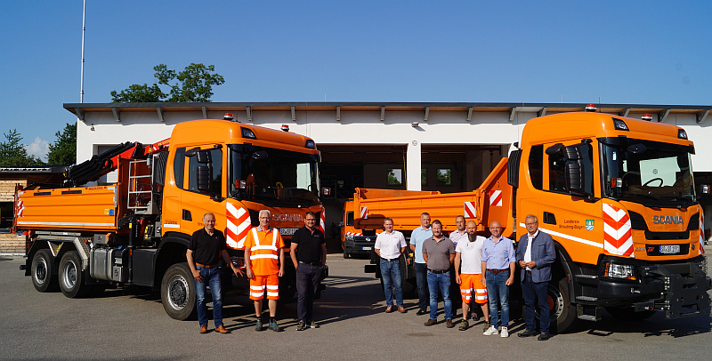 „Es ist für uns wichtig, dass die Mitarbeiter der Bauhöfe moderne Arbeitsgeräte haben, mit denen eine sichere und leistungsfähige Arbeit gewährleistet ist“, so Landrat Josef Laumer bei der Vorstellung der beiden LKW durch die Straßenmeister und die beiden Fahrer Franz Stettmer und Tobias Janik.