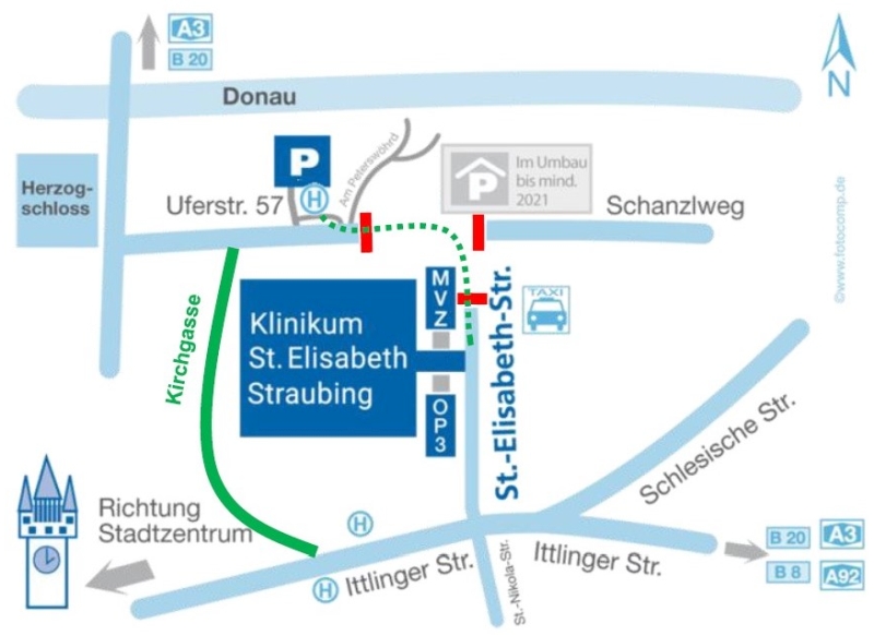 (ra) An der Kreuzung Uferstraße – St.-Elisabeth-Straße – Schanzlweg wird von 2. August bis 13. September ein Kreisverkehr errichtet. Dazu ist eine Vollsperrung der Kreuzung notwendig. Die St.-Elisabeth-Straße, die Uferstraße und der Schanzlweg werden dadurch zu Sackgassen. Das Absetzen von Patienten ist an der St.-Elisabeth-Straße sowohl am Haupteingang als auch am MVZ weiterhin möglich. Auch die Notfallzufahrt bleibt über die St.-Elisabeth-Straße ständig zu erreichen.
