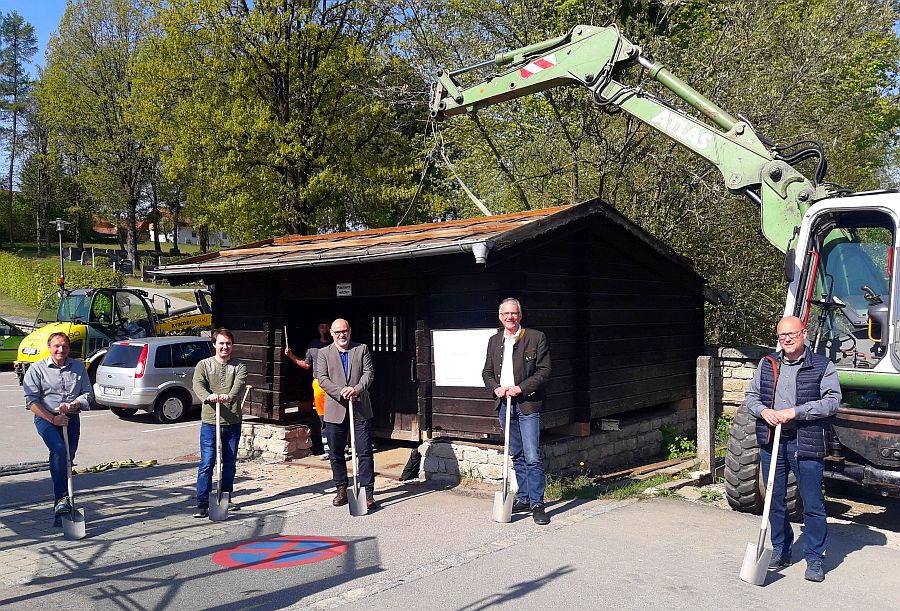 Bauhofvorarbeiter Max Bschlagengaul entfernte mit seinen Kollegen als erstes die bisherige Holzbaracke zur Unterbringung der Friedhofsutensilien. Das neue Gebäude wird zukünftig mehrere Funktionen erfüllen und wurde in diesem Umfang erst durch eine hohe, zweckgebundene Erbschaft der Gemeinde für den Friedhof möglich. Nicht zuletzt soll es durch seinen Standort den alten Ortskern mit den neu entstandenen Gebäuden am Ortsrand verbinden.