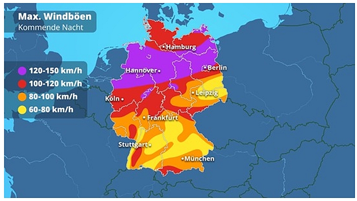 Am Donnerstagmorgen kommt es verbreitet zu Behinderungen im Straßen- und Schienenverkehr. Mit einer stürmischen Nacht ist der Spuk aber nicht vorbei. Am Donnerstag selbst ist es noch verbreitet mit Windspitzen von 70 bis 100 Kilometer pro Stunde sehr stürmisch und an der Nordsee droht Sturmflutgefahr. Solche Windgeschwindigkeiten reichen aus, um Bäume umstürzen zu lassen. Zudem können größere Äste herunterfallen und schwere Verletzungen verursachen. Auch Gegenstände und Dachziegel fliegen dabei leicht durch die Luft. Dementsprechend sollten zum Beispiel Baugerüste und Wälder gemieden werden.