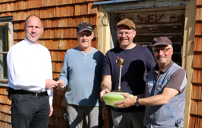 Nun ist es so weit: Zimmerer Franz Plöchinger und Maurer Franz Dillinger überreichten am Mittwoch an Museumsleiter Timm Miersch und Depotleiter Konrad Obermeier symbolisch den Schlüssel für das Haus. Dabei handelt es sich um den Originalschlüssel des Gebäudes, das ursprünglich in Pronfelden bei Spiegelau gestanden hatte.