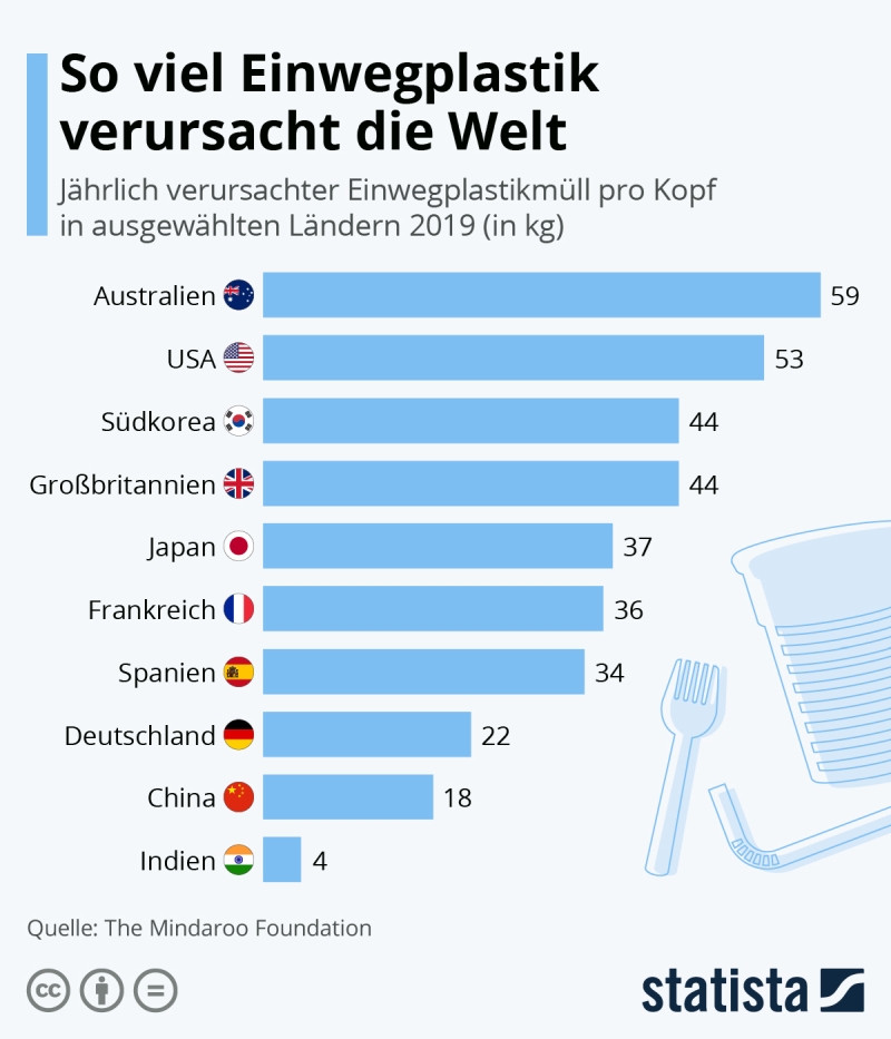 Australien zählt demnach zu Ländern mit dem höchsten Einwegplastikmüll-Verbrauch, mit 59 Kilogramm pro Kopf im Jahr 2019. Auch die USA und Südkorea verursachen besonders viel Einwegplastikmüll, wie die Statista-Grafik zeigt. Deutschland steht mit 22 Kilo Einwegplastikmüll pro Kopf im internationalen Vergleich noch gut da, im Vergleich zu Ländern wie Indien (4 Kilo pro Person) ist der Müllverbrauch aber auch hier zulande noch zu hoch.