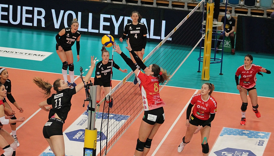 Mit Ausnahme des letzten Satzes lieferten die Raben mehr noch als im ansehnlichen ersten Duell am Mittwoch den prominent besetzten Potsdamerinnen einen großartigen Fight auf Augenhöhe – und teilweise knapp darüber. Entscheidender Faktor war, dass die Völker-Schützlinge sowohl den zweiten als auch den dritten Satz trotz einer kämpferisch mitreißenden und volleyballerisch beeindruckenden Leistung jeweils hauchdünn abgeben mussten.