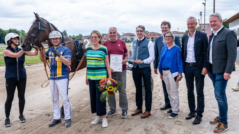 Beinahe hätte es noch mehr Siege des Dreamteams Manfred Schub/Christoph Fischer gegeben, doch der „Renngott“ hatte andere Pläne. Im Trotteur Français-Rennen schnappte sich Rudi Haller gleich die Führung und rettete sich vor Iathenus Day, der den weiteren Weg gehen musste, ins Ziel. Good Fellow belegte Rang drei. Emmanuelle Morvillers durfte Itturia die schmucke Siegerdecke und die Trophäe von Le Trot überreichen und dem Siegfahrer und der freudigen Besitzergemeinschaft Ligsalz/Werkstetter gratulieren. Danach besuchte sie aber auch noch den Viertplatzierten Fan d’Arifant, der mit seinen 33 Siegen in Deutschland Trabergeschichte geschrieben hat. Morvillers bezeichnete den französischen Supertraber als „Botschafter des französischen Pferdes in Deutschland“.