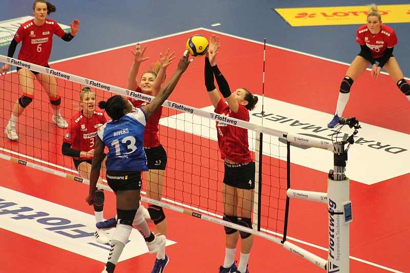 Coach Florian Völker nahm im Vergleich zur Vorwoche in der Anfangsformation eine Änderung vor: Dezember-Neuzugang Alexis Hart rückte auf die Diagonalposition und feierte somit, nach dem Einsatz als Einwechselspielerin beim 1:3 gegen Dresden, ihr Debüt in der Starting Six. An der Seite der US-Amerikanerin stellten sich zu Spielbeginn Lena Möllers als Zuspielerin, die Außenangreiferinnen Danielle Brisebois und Jodie Guilliams, Josepha Bock und Kayla Haneline im Mittelblock sowie Myrthe Schoot als Libera dem Spitzenreiter entgegen.