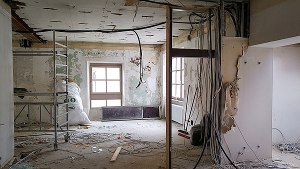 In den letzten beiden Wochen wurden zusätzliche Untersuchungen zum Schädigungsgrad an der Bausubstanz durchgeführt. Durch die erzielten Ergebnisse der Bodenöffnungen und Feuchtigkeitsmessungen können dann weitere Rückbauten festgelegt und zielgerichtete Trocknungsmaßnahmen durchgeführt werden. Um die verschiedenen Bau- und Umbauphasen und die unterschiedlichen Nutzungen der Räume seit Bestehen des Rathauses feststellen zu können, geht auch die bauhistorische Bestandserfassung in allen Geschossen weiter.