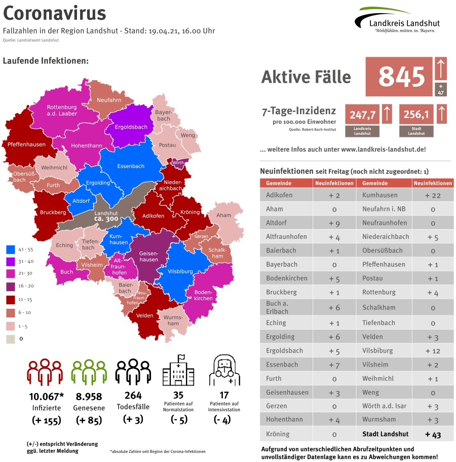 Seit Pandemiebeginn wurde bei insgesamt 10.087 Bürgerinnen und Bürger, die ihren Erstwohnsitz in Stadt oder Landkreis Landshut gemeldet haben, eine Infektion mit dem Corona-Virus festgestellt. Davon konnten 8.958 die häusliche Quarantäne wieder verlassen (+ 85). Drei Betroffene sind nach stationärer Behandlung an COVID-19 verstorben (73, 82 und 84 Jahre alt). „Aktive“ Infektionen sind bei 845 Betroffenen bekannt (+ 47).