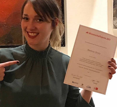 Grotz nahm den mit insgesamt 20.000 Euro dotierten Wissenschaftspreis am Mittwoch in Salzburg entgegen. Zusammen mit ihr wurden 17 weitere junge Frauen und Männer in insgesamt vier Kategorien ausgezeichnet. Eingereicht werden konnten Themen, die für die Interessen der Beschäftigten von Bedeutung sind. Zum fünften Mal vergab die AK Salzburg heuer einen Wissenschafts- und zum vierten Mal einen Förderpreis.