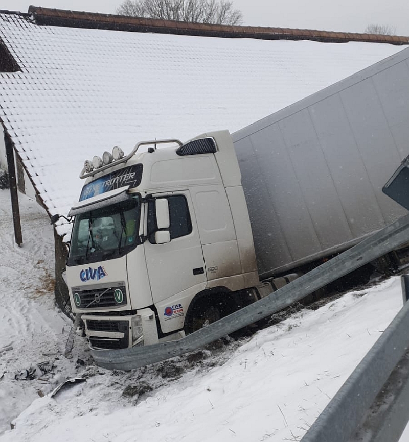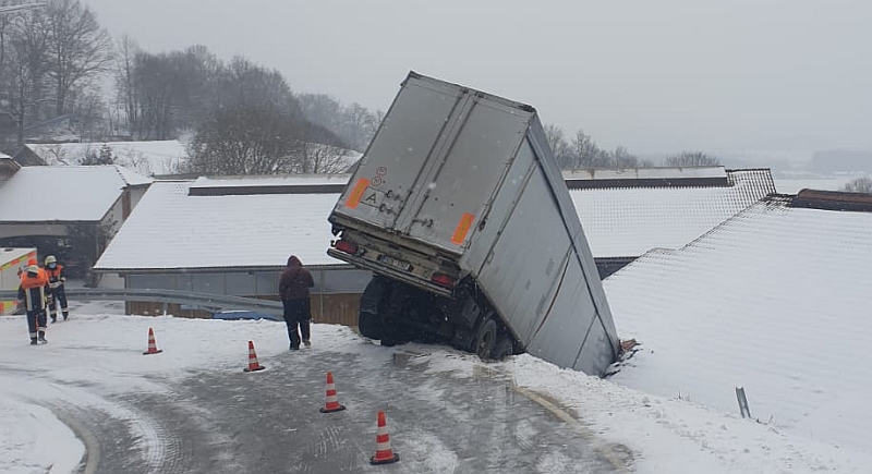 (pol) Der Fahrer eines Sattelzuges geriet am Mittwochmittag in der Ortschaft Rottensdorf (Gemeinde Loitzendorf) auf abschüssiger Fahrbahn bei einem Bremsvorgang ins Rutschen, kam nach rechts von der Fahrbahn ab, durchbrach die dortige Leitplanke und stieß gegen den Kuhstall eines angrenzenden landwirtschaftlichen Anwesens.