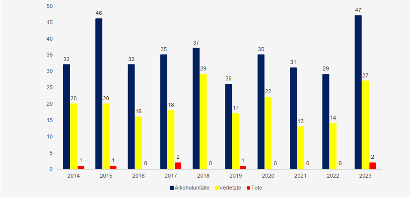 Zahl der Alkoholunfälle erreichte 2023 einen Höchststand. Zwei Personen verstarben dabei – Grafik: Polizei