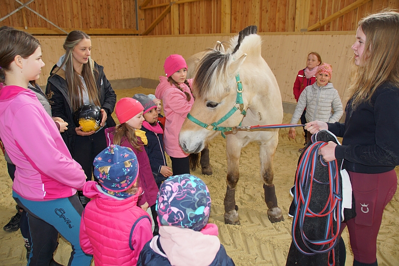 Nach kurzer Pferdekunde und einer Vorstellungsrunde mit Ball-Zuwerfen ging es ans Putzen der beiden Norweger. „Felix und Irino müssen vom schmutzigen Winterfell befreit werden“, leitete Pädagogin und Reittherapeutin Tamara die eifrigen Kinder an. Und die konnten es gar nicht erwarten, bis jeweils zwei Kinder einige Runden in der Halle reiten durften, während die anderen sich bei lustigen Spielen vergnügten.