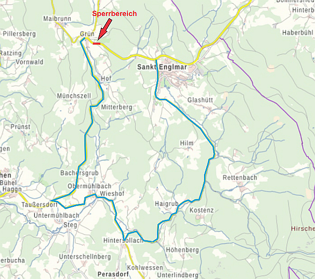 Anliegerverkehr bis zur Baustelle ist möglich. Die Umleitung erfolgt ab Sankt Englmar über die Kreisstraße SR21 Richtung Hintersollach – Staatsstraße St 2147 – Kreuzhaus – Staatsstraße St2139 – Grün und umgekehrt.