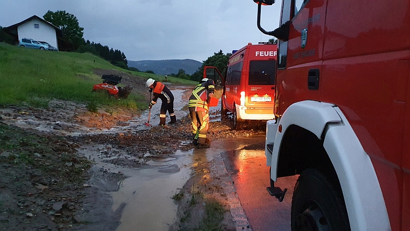 Bei zwei Gebäuden wurde die Feuerwehr zum Wasserabpumpen im Keller gerufen. Die Einsatzkräfte leiteten ein von einem Hang herabströmendes Wasser in einen Straßengraben um, damit ein weiteres Gebäude von Schaden zu bewahren. Auch einen Kanaldeckel, der durch die Wassermassen ausgehoben wurde, setzten die Feuerwehrler wieder ein.