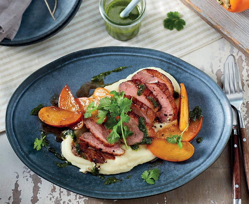 Entenbrust mit karamellisierter Kaki, Selleriecreme und Korianderpesto