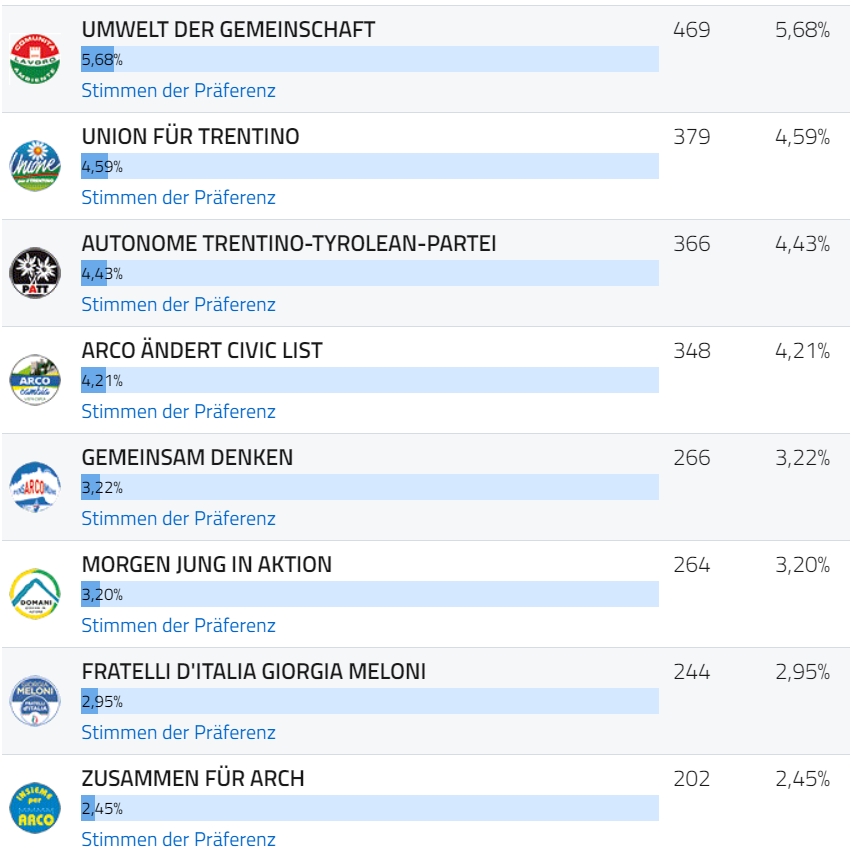 Für Giacomo Bernardi (Mitte rechts) gab es 2238 Stimmen oder 23,50 Prozent. Er wird unterstützt durch die Listen Lega Autonomia Salvini Trentino 827 (10,01 Prozent), Siamo Arco Giacomo Bernardi Sindaco 719 (8,70), Fratelli d`Italia Giorgia Meloni 244 (2,95), Unione per Arco per un Impegno Civico Con Giacomo Bernardi Sindaco 169 (2,05 Prozent) und Forza Italia Berlusconi Presidente Bernardi 102 (1,23 Prozent).