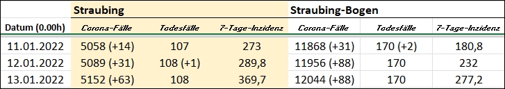 Die 7-Tage-Inzidenzen liegt am Donnerstag in der Stadt bei 369,7 und im Landkreis bei 277,2. Eine Woche vorher meldete das RKI für Straubing eine Inzidenz von 210 und für den Landkreis von 163,2.