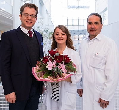 „Wir begleiten eine werdende Mutter in der Schwangerschaft bis zur Geburt. Ebenso kümmern wir uns um Patienten mit einer Tumorerkrankung und begleiten sie durch die Therapie. Auch operativ decken wir ein breites Gebiet ab“, so Susann Scheunpflug. Seit über vier Jahren ist die Frauenärztin am Klinikum Landshut tätig, jetzt wurde sie im Team von Chefarzt Dr. Ingo Bauerfeind zur Oberärztin berufen. Dazu gratulierten Geschäftsführer Nicolas von Oppen und Chefarzt Dr. Bauerfeind am Freitag herzlich.