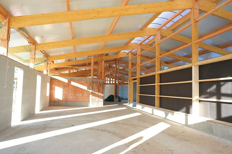 (ra) Die Bauarbeiten auf der Theo-Großbaustelle Am Regenbogen 2 in Zeitlarn gehen zügig voran. Die Baufirma Donhauser hat am 10. September die Bodenplatte für Stall und Lagerräume betoniert und dann mit dem Sozialgebäude begonnen. Ende Oktober startete die Holz-Fertigbau-Firma Römmelt mit dem Aufstellen von Stall und Mehrzweckhalle. Zu Weihnachten waren bereits Stall, Reithalle und Sozialgebäude im Rohbau fertig.