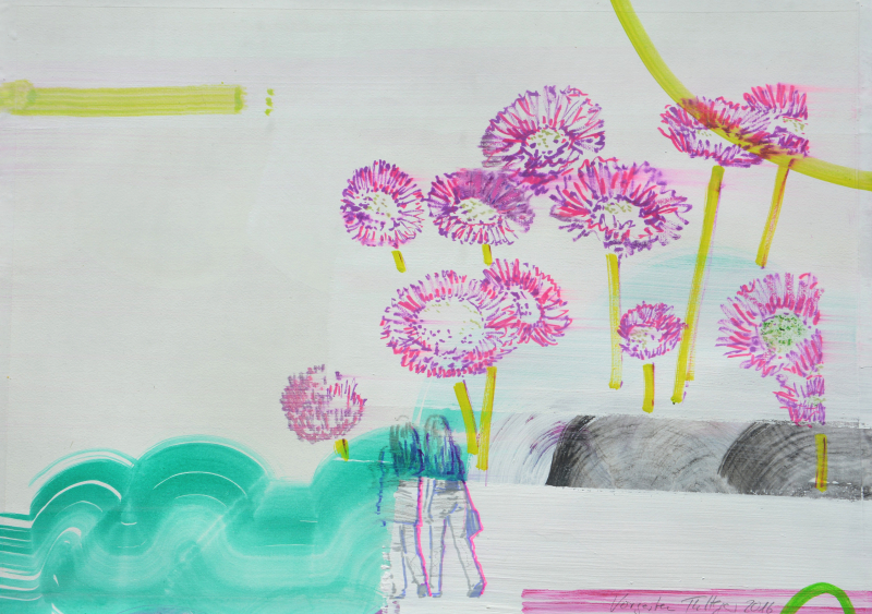 Aus der Nähe betrachtet sind die Farbflächen jedoch belebt und zeigen kleine Figuren. Sie stehen oft einzeln oder wandern in Gruppen wie Flaneure durch die flächenhaften Bildlandschaften. Aus der Serie „Tage am Meer“ werden zudem einige Arbeiten zu sehen sein, die Schwimmern zwischen blaugefärbten Pinselspuren Platz geben. Der miniaturhafte Maßstab lässt den Menschen etwas in den Hintergrund rücken.