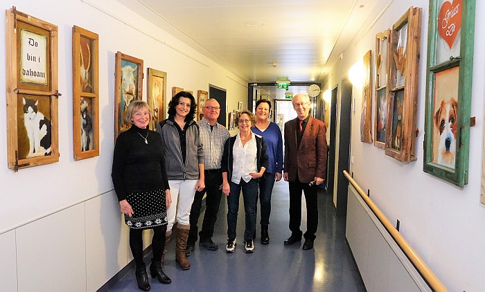 (ra) Ausgedienten Schätzen aus Bauernhöfen hat die Malgruppe „Prosecco & Acryl“ mit aufgemalten Tiermotiven und flotten Sprüchen neues Leben eingehaucht. Die alten, aber neu aufbereiteten Fensterrahmen, Schubladen, Hufeisen, Türen oder Garderobenbretter mit den tierischen Charakterköpfen sind ab sofort im Erdgeschoß der Klinik Bogen ausgestellt. Wilhelm Lindinger, Vorsitzender der Freunde und Förderer der Klinik Bogen e. V. begrüßte am Donnerstagnachmittag die Aussteller Rosi Baumgartner, Evi Högerl, Inge Niedermayer, Ilse Rudlof, Brigitte Zimmermann und Waldemar Zimmermann am Haus: