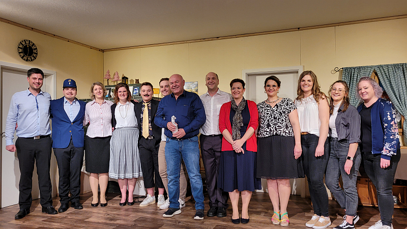 Der Vorsitzende Troiber dankte dann allen Helfern vor und hinter der Bühne bat schließlich auch den Autor auf die Bühne. Er überreichte ihm dabei ein „kleines Dankeschön“ für dieses erlebbar äußerst gelungene Stück. Dieses habe schließlich den großen Erfolg der Theatersaison 2023/2024 mit einer eigens anberaumten Zusatzvorstellung erst möglich gemacht.