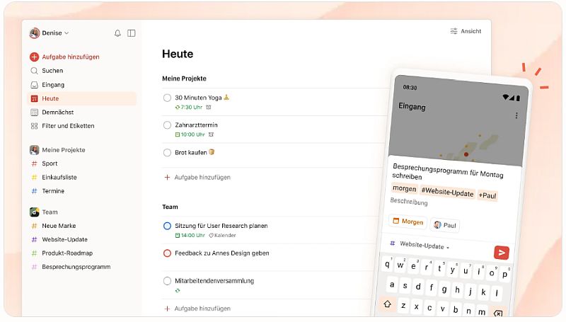 Todoist gehört zu den führenden To-Do-Listen-Apps für Arbeit und Alltag. Auf der offiziellen deutschen Seite werden besonders drei Funktionen hervorgehoben: