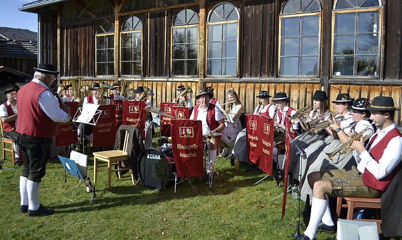 Der Käsestand war ebenso gut frequentiert wie die Essensstände, beim Café Heimat waren schon ab Vormittag alle Plätze besetzt und auch das Museumswirtshaus „Ehrn“ hatte alle Hände voll zu tun. Für die musikalische Umrahmung sorgte die „Stamm-Blaskapelle Annathal“, die den ganzen Nachmittag bei strahlendem Sonnenschein vorm Salettl aufspielte.