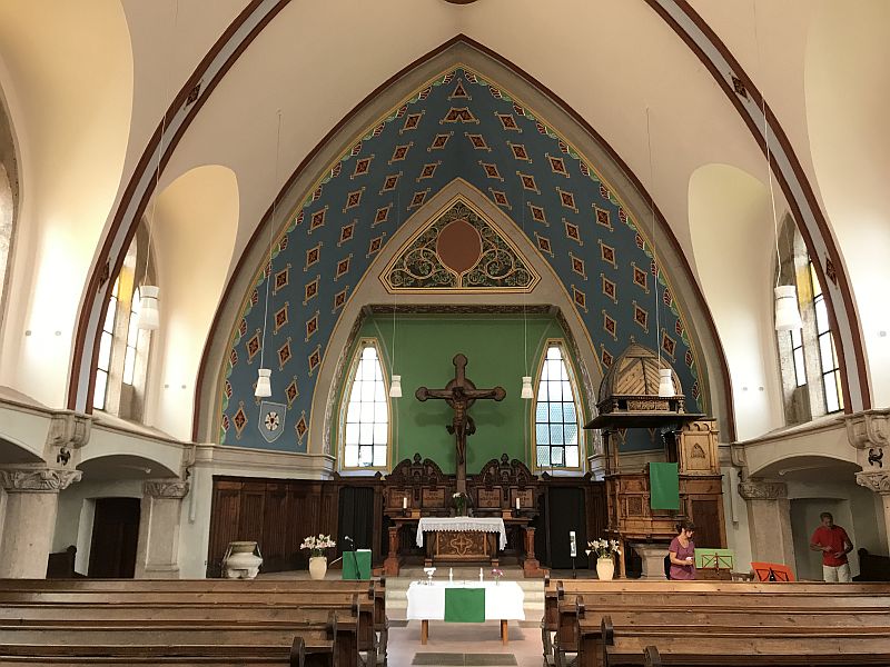 Im Inneren zeigt sich die Kirche schlicht und klar gegliedert: eine zentrale Hallenanlage mit Spitzbogen‑Gewölbe, ein umlaufender Atriumgang sowie überlieferte Holz‑Arbeiten wie Kanzel und Altarmöbel von den Colli‑Brüdern aus Innsbruck, ergänzt mit einem Kruzifix und Marmorelementen aus der katholischen Phase.