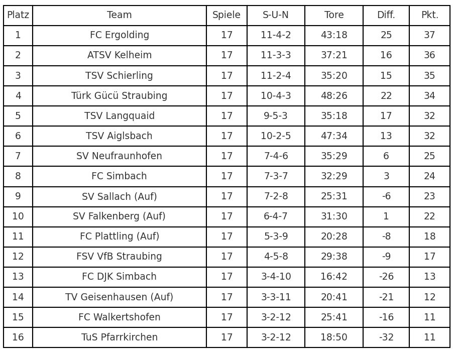Aktuelle Tabelle Niederbayern Bezirksliga-West