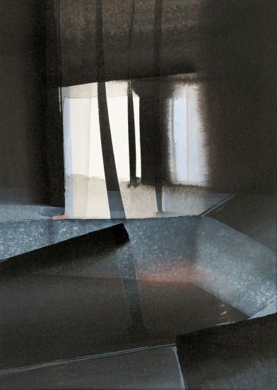 Naused arbeitet mit Tuschemalerei und baut daraus kompakten wie transparenten Flächen. Breite und schmale Pinselstriche erzeugen geheimnisvolle Bildwelten voller Tiefe. Man sieht Zimmer, Hallen, Treppenhäuser und spiegelnde Böden; Licht fällt durch Mauerfugen, Fenster und Gardinen.