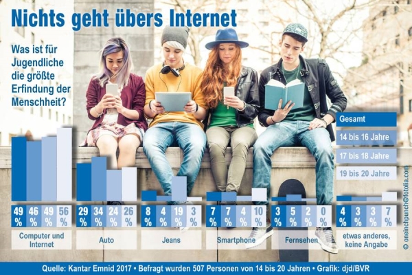 In einer Kantar-Emnid-Umfrage im Rahmen des 48. Internationalen Jugendwettbewerbs „jugend creativ“ der Volksbanken und Raiffeisenbanken wurden Computer und Internet von 49 Prozent der Befragten als größte Erfindung aller Zeiten bezeichnet. Mit weitem Abstand folgt das Auto (29 Prozent), die Jeans (acht Prozent) und das Smartphone (sieben Prozent). Auffällig, dass bei den 17- und 18-Jährigen immerhin 19 Prozent die Jeans für die wichtigste Erfindung halten, bei den 14- bis 16-Jährigen nannte mehr als ein Drittel das Auto – obwohl diese Altersgruppe noch gar nicht fahren darf.